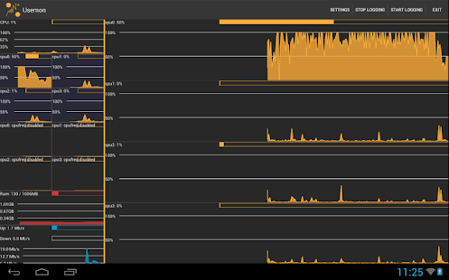 Usemon is a simple application for monitoring usage of system resources. It displays graphs of CPU, RAM, and network usage. (For dual and quad core devices per core stats are supported.) No root needed. It is extremely lightweight, because it gets these data directly from the kernel. It can show permanent statusbar notifications of these too (when enabled). It support devices running android 4.0 and higher, thanks to that it integrates well into the holo themed system.
